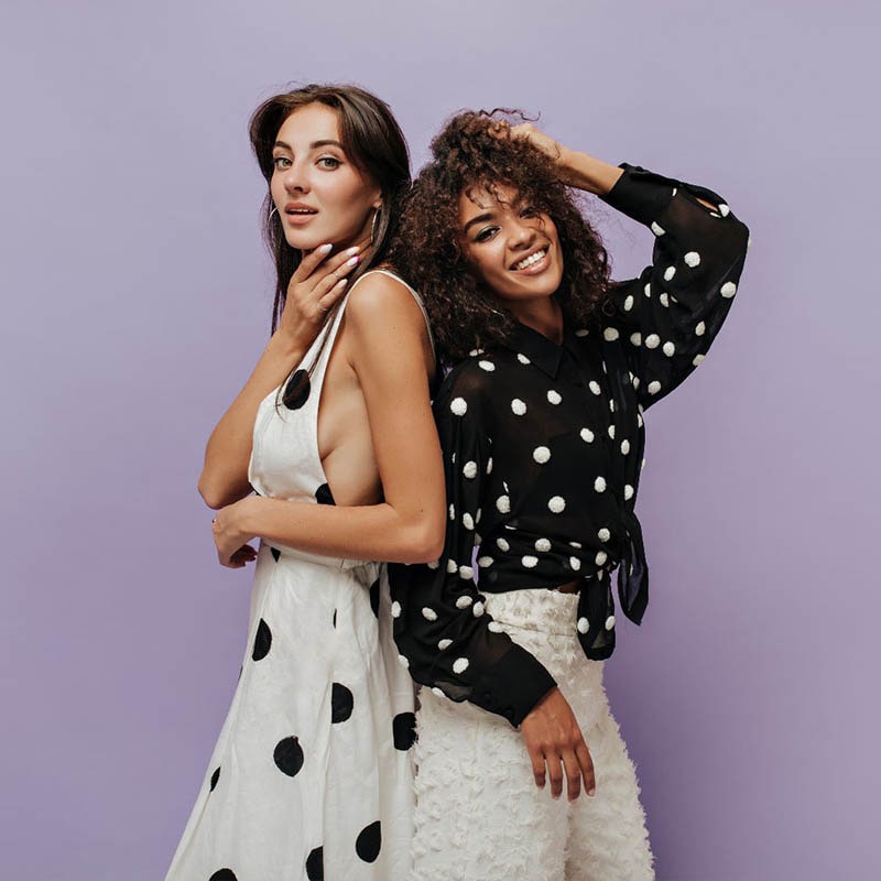 Vestito a pois bianco e nero con cintura in vita, collo a “V” e senza maniche. Tessuto morbido e fluido, silhouette avvitata e svasata. Look elegante e femminile, facile da abbinare.